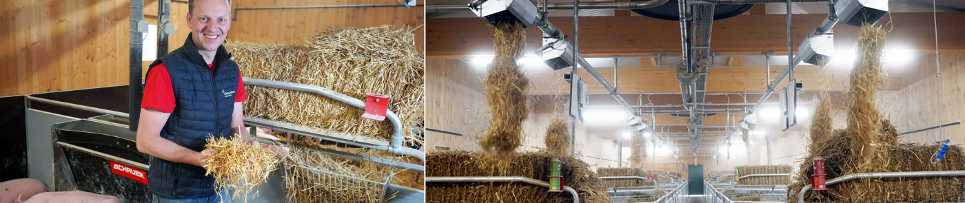 Proposer des matériaux manipulables organiques aux cochons est une nécessité pour favoriser le bien-être des animaux dans l’élevage porcin et pour le respect de la législation. En règle générale, cette nécessité requiert un grand effort de main d’œuvre. Jusqu’à présent, dans les élevages plus importants, les systèmes de paillage Strohmatic et Spotmix représentent un instrument couronné de succès quand il s’agit de broyer et distribuer la paille automatiquement. Grâce au nouveau développement Strohmatic light, il est désormais possible de démêler la paille broyée et pressée en big et de la distribuer selon les besoins dans tout le bâtiment à l’aide d’une chaîne à pastille en diamètre 80 mm ou 200 mm.